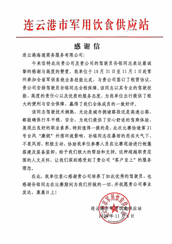 近日,汽服公司權(quán)屬汽車租賃事業(yè)部收到了一封來自連云港市軍用飲食供應(yīng)站的感謝信,信中表達(dá)了對(duì)租賃事業(yè)部政務(wù)保障車駕駛員孫銘的感謝與肯定。紙短情長,一封感謝信承載了客戶對(duì)駕駛員的信任與感激,也傳遞了汽服公司“客戶至上”的服務(wù)理念。