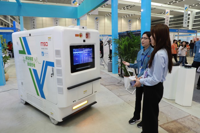 現(xiàn)場的海宏科技充電移動(dòng)機(jī)器人移動(dòng)演示吸引了眾多參觀者駐足觀看并打卡拍照。其高效便捷的充電方式和智能化的操作流程,展示了公司在智能充電領(lǐng)域的創(chuàng)新實(shí)力和對綠色出行未來的積極探索,成為展會(huì)的一大亮點(diǎn)。MSO移動(dòng)充電機(jī)器人搭載了全球同類設(shè)備中最大容量的209kWh磷酸鐵鋰儲(chǔ)能電芯,采用120kW液冷快充,在同類產(chǎn)品中處于領(lǐng)先位置,同時(shí)移動(dòng)充電機(jī)器人輸出電壓支持1000v的高壓平臺(tái)。在硬件上,是全球唯一一家采用伺服驅(qū)動(dòng)麥克納姆輪方案,可以實(shí)現(xiàn)360°全方位旋轉(zhuǎn)以及平移、側(cè)移,對通過狹小空間極具優(yōu)勢,滿足不同場景需求,極大簡化自動(dòng)駕駛邏輯。車身搭載激光雷達(dá)、超聲波避障以及360°環(huán)視;基于硬件,可實(shí)現(xiàn)低速自動(dòng)駕駛與5G云駕駛,同時(shí)融合了分布式儲(chǔ)能、快速充電樁與移動(dòng)機(jī)器人的產(chǎn)品屬性,顛覆傳統(tǒng)車找樁模式,開啟新能源時(shí)代樁找車的全新生活方式。