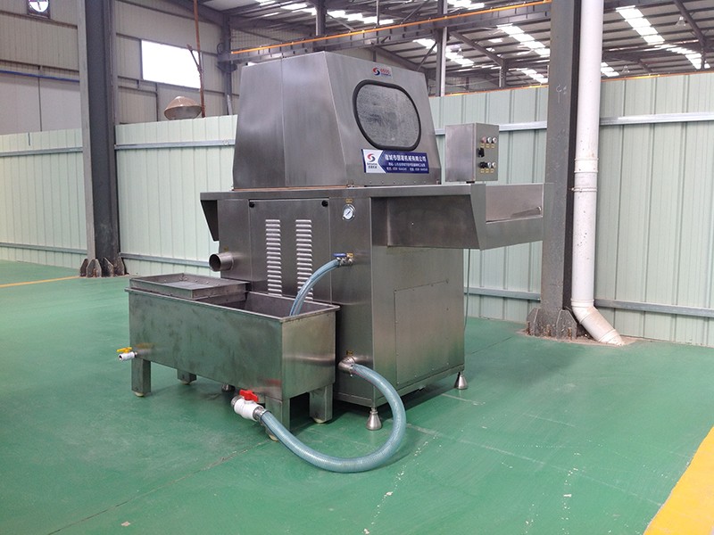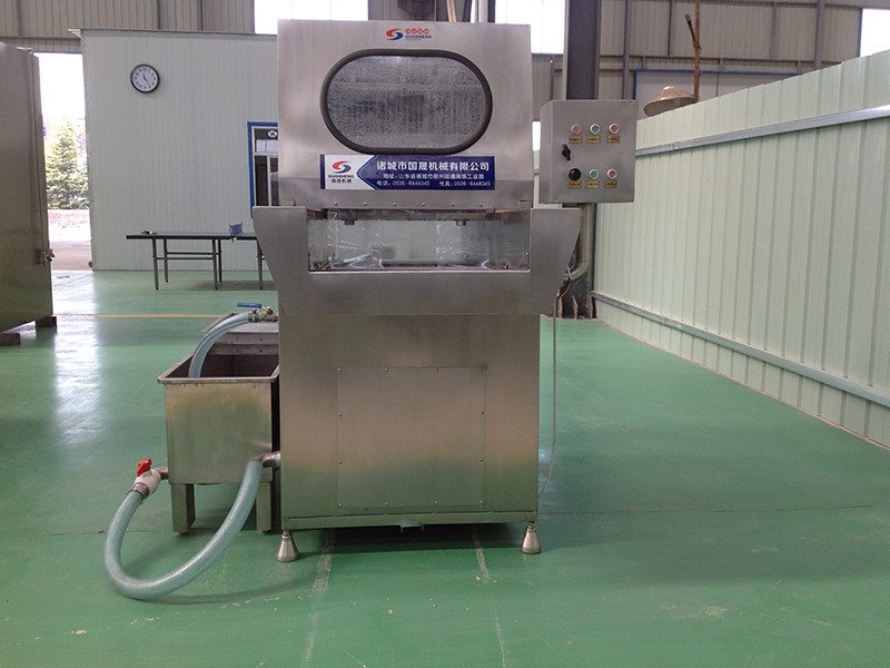 本機可將鹽水及輔料配制的腌漬均勻地注射到肉塊中,縮短了腌漬時間,大大提高了肉制品的口味及出口率??筛鶕?jù)工藝師要求調節(jié)注射壓力,腌漬劑均勻連續(xù)入肉中,達到理想的注射效果。本機設計嚴謹、結構合理、操作簡便,設有自動保護裝置,當注射針碰到硬物時注射針隨之抬起,不受損壞,是肉制品加工過程中的理想設備。