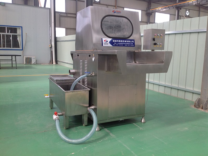 本機可將鹽水及輔料配制的腌漬均勻地注射到肉塊中,縮短了腌漬時間,大大提高了肉制品的口味及出口率。可根據(jù)工藝師要求調(diào)節(jié)注射壓力,腌漬劑均勻連續(xù)入肉中,達到理想的注射效果。本機設(shè)計嚴謹、結(jié)構(gòu)合理、操作簡便,設(shè)有自動保護裝置,當(dāng)注射針碰到硬物時注射針隨之抬起,不受損壞,是肉制品加工過程中的理想設(shè)備。